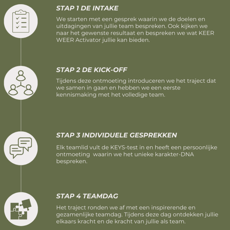 Bij KEER WEER Activator werken we met een helder en stapsgewijs proces om het potentieel van jullie team zichtbaar te maken.